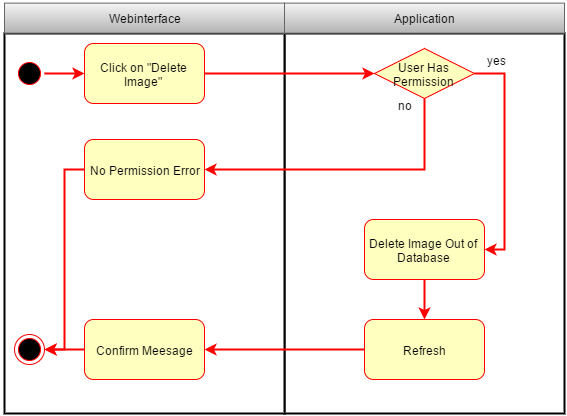 In dem Use Case "Delete Image" löscht der User (Rolle Admin) ein Image aus der Datenbank. Zuerst wird geprüft ob der User die Berechtigung besitzt, falls dieser dazu berechtigt ist wird das Image aus der Datenbank gelöscht und die Seite neu geladen. Anschließend wird der User über das erfolgreiche Löschen des Images informiert.