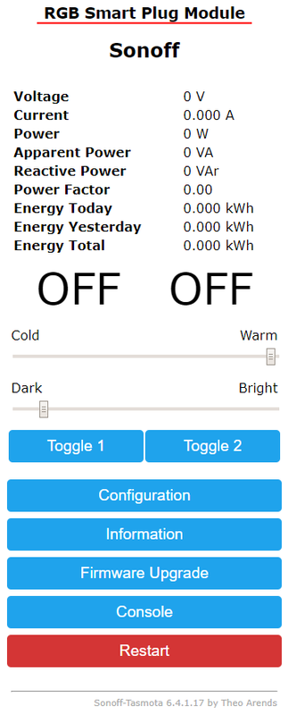 BlitzWolf SHP (45)module as BASE since the power monitoring circuitry is identical but GPIO00, GPIO02 were changed and an unused GPIO04 was added to enable the RGB LED function. Using that specific module we took advantage of that module's calibrated power monitoring special programming which theGeneric (18)module does not use.