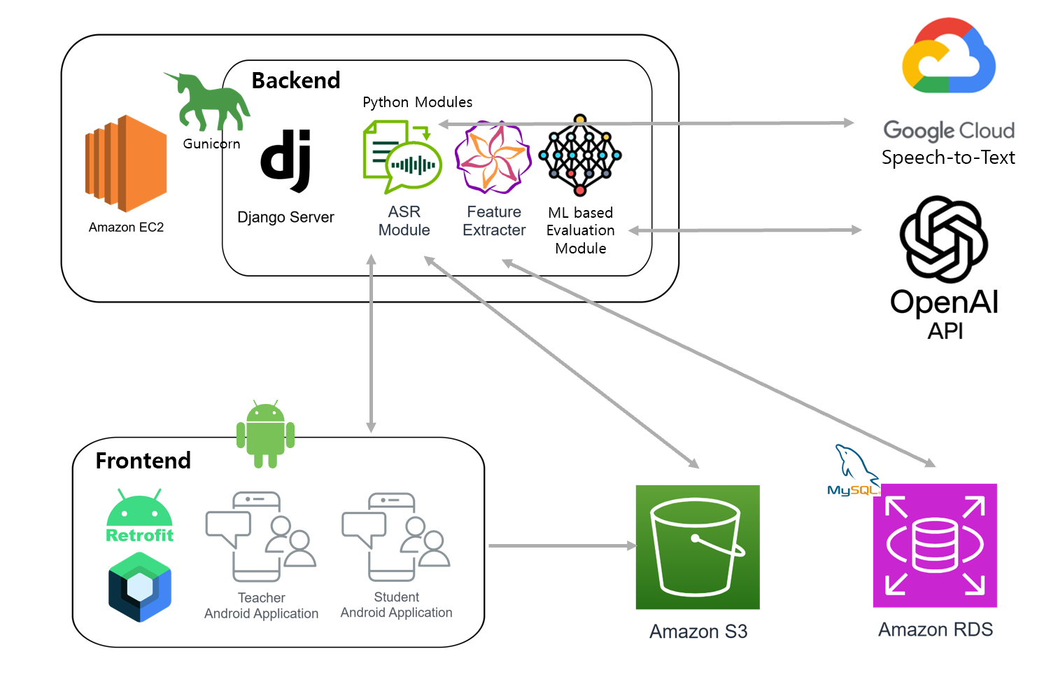 | ML Worker (Internal) | In-process model inference (synchronous) | Confidence scoring via XGBoost regression on acoustic and semantic features extracted from student responses | XGBoost 3.0.5, joblib, scikit-learn | Django application logging, inference latency tracking |