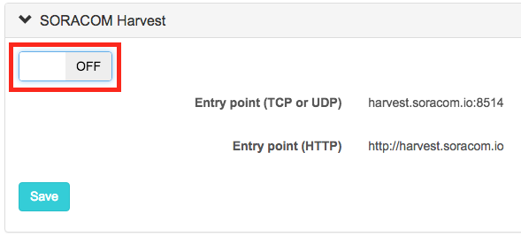 - Click on "SORACOM Harvest" to open setting and change toggle switch to "ON", then press "Save".
