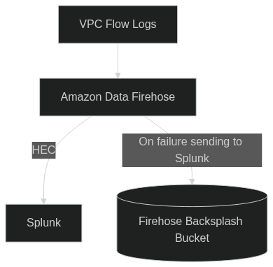 VPC Flow Logs can be sent directly to a Amazon Data Firehose, bypassing CloudWatch Logs or S3 before sending events to Splunk. The advantage of this is primarily cost savings, but the disadvantage is that the only copy of the VPC Flow Logs will exist in Splunk. In the event that the Firehose cannot reach Splunk, events are sent to an S3 backsplash bucket for later retrieval.