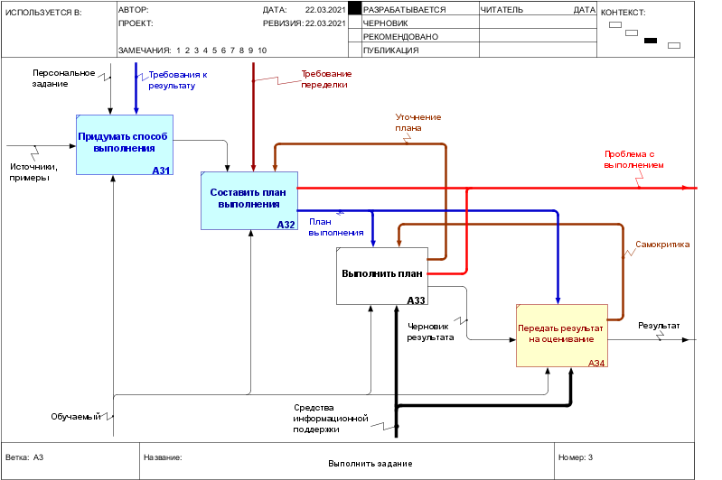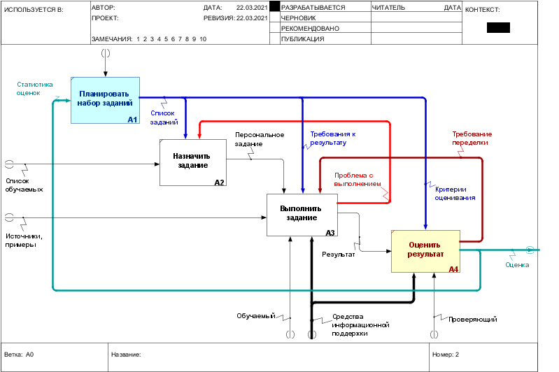 В рамках образовательного процесса имеет смысл раздельно рассматривать процессы общего планирования (А1), диспетчеризации (А2), выполнения (А3) и оценки (А4). При этом следует не забывать о возможности возникновения нештатных ситуаций в каждом из рассматриваемых в диаграмме процессов, порождающих дополнительные потоки обратной связи с необходимостью их специальной обработки (выход А3 --> управление А2; выход А4 --> управление А3), Кроме того, в теории управления считается, что системы без информационных обратных связей от процессов контроля к процессам управления (выход А4 --> вход А1) неработоспособны.