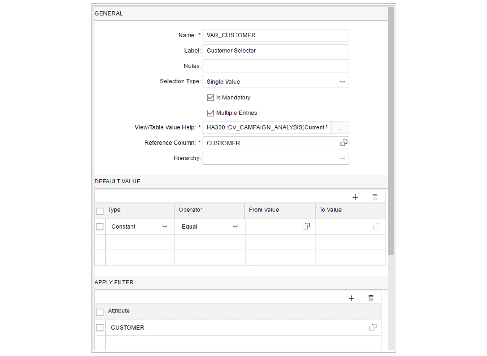 View/Table Value Help: The setting is used to define which table/view SAPHANA will fetch the data to show in the prompt. The Reference Column defines which (unique) column in this table/view will provide the possible values for the variable.