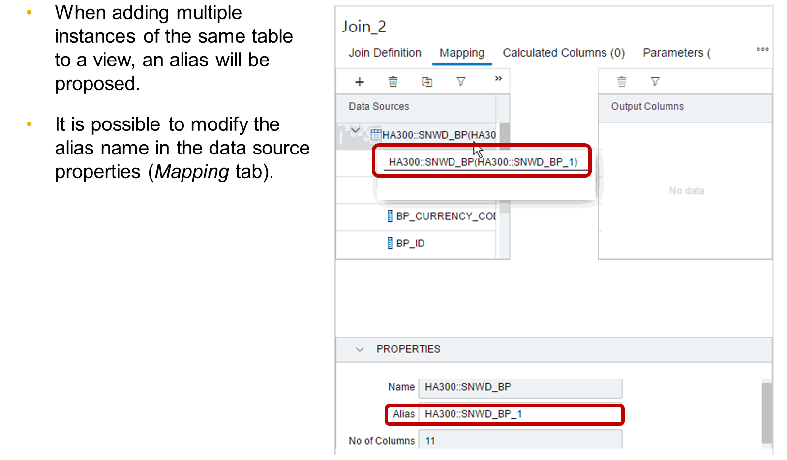 In some cases, you need to use the same data source more than once in a calculation view. Although it is possible to include the same data source multiple times in the same calculation view, each instance needs a unique name to identify it.
