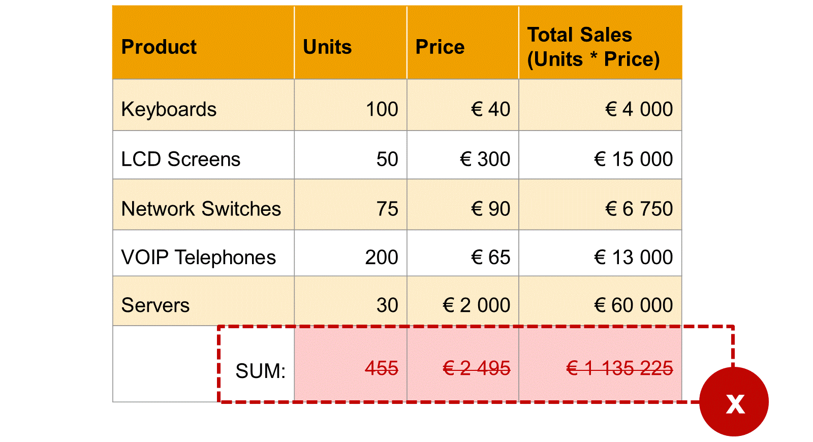 In the figure, in the sum line highlighted in red, the units as well as the price have been aggregated. Multiplying these to aggregates does not give a meaningful result.