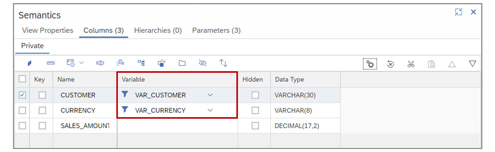In some cases, your calculation view needs to pass information provided by the user, via a variable or input parameter, to another object. This could be another calculation view or even a procedure or function.