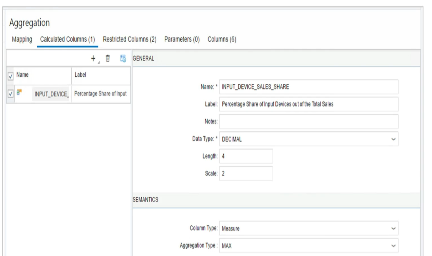 Consider an example where you have created the calculated measure MAXIMUM_GROSS_AMOUNT, giving you the maximum value of the gross amount. By selecting the Enable client side aggregation checkbox, you propose to the reporting client to also apply a maximum aggregation on the client side as defined in the Aggregation Type dropdown list.