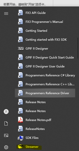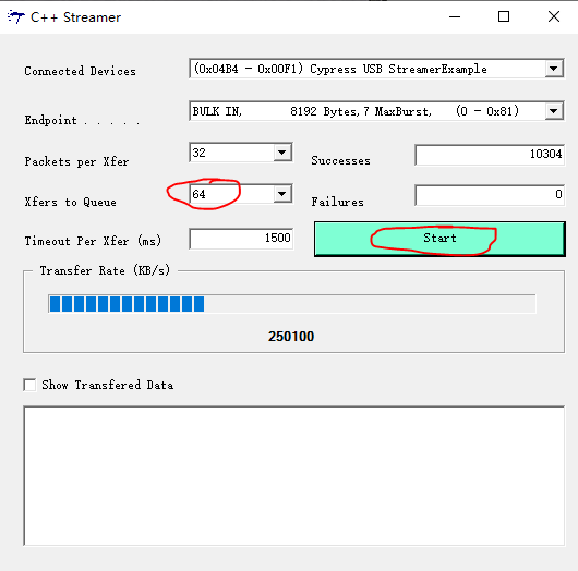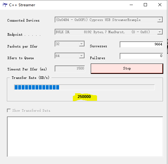 进入软件后,会自动识别到FX3设备,按照下图中设置后,单击Start按钮后既可以进行Streamer测试。