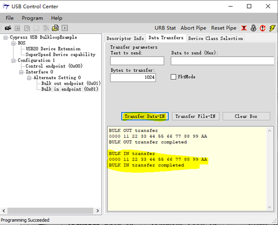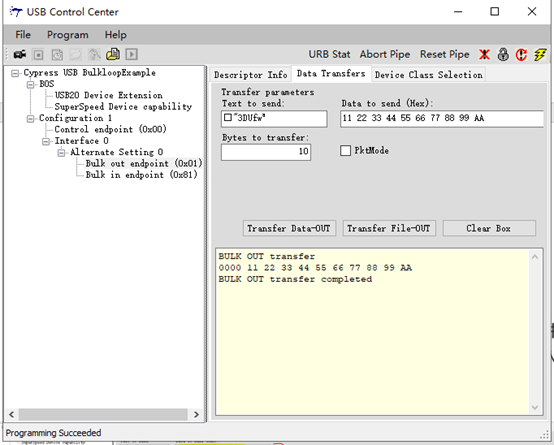 在上一节基础上,单击打开Cypress USB BulkLoopExample。选中Bulk out endpoint(0x01)选项,在Data Transfers-->Data to send(Hex)中输入要发送给FX3的数据。单击Transfer Data-OUT发送数据。