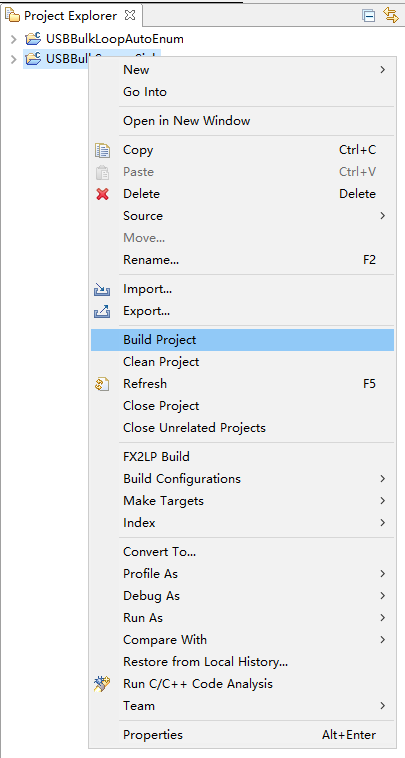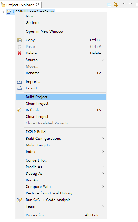 在Project Explore下会出现新导入的工程,选中该工程并右击,弹出的菜单中选择Build Project对工程进行编译。