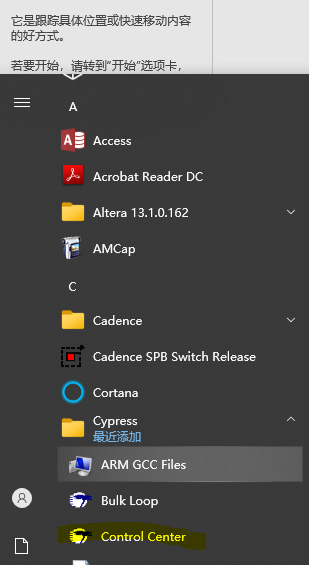 开始 > 程序 >Cypress > Cypress USBSuite > Control Center