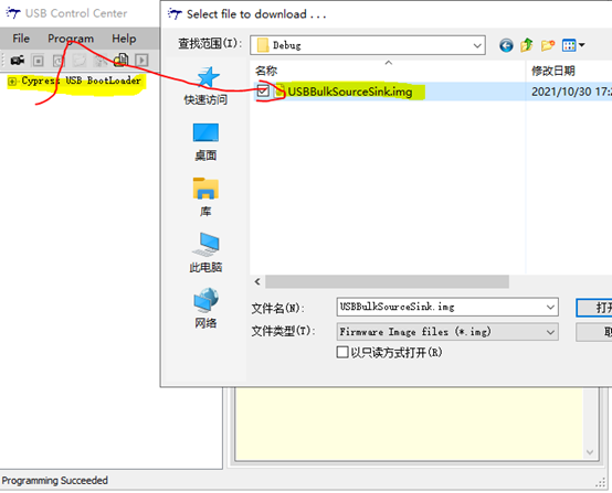 工作窗口中原先的Cypress USB BootLoader就编程了我们下载固件的名字(Cypress USB StreamerExample)。