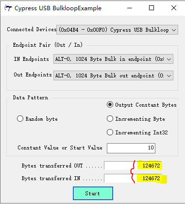 点击Start 按钮运行一段时间后,可以对比Bytes transferred OUT好Bytes transferred IN后面的统计,看下LoopBack测试下有没有丢包。
