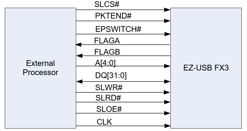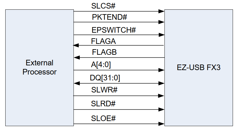 外部处理器或设备(作为接口主设备)可以对FX3的内部FIFO缓冲区执行单周期或突发数据访问。在断言读或写选通之前,外部设备在FIFO ADDR线上显示5位地址(带或不带EPSWITCH#)。FX3断言或取消断言标志信号,以指示缓冲区的空/满状态。