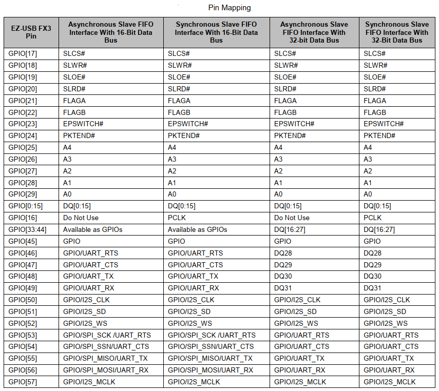 下表显示了SDK中从FIFO描述的引脚映射。它还显示了GPIF II配置为从FIFO接口时可用的GPIO引脚和其他串行接口(UART、SPI和I2S)