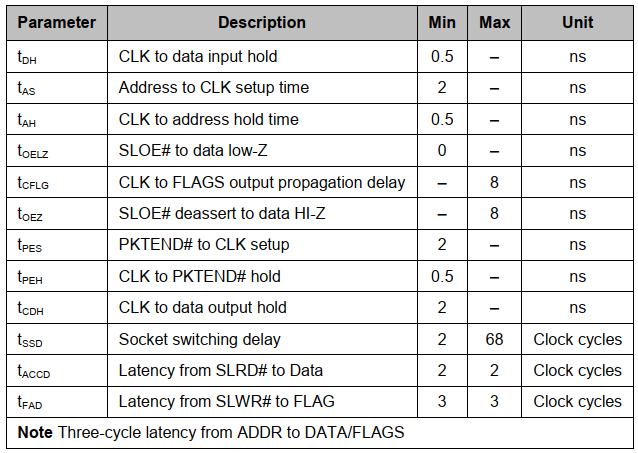 由于延迟增加和额外的接口协议要求,建议仅当应用程序需要访问四个以上的GPIF II插槽时,才使用具有五条地址线的同步从属FIFO接口。