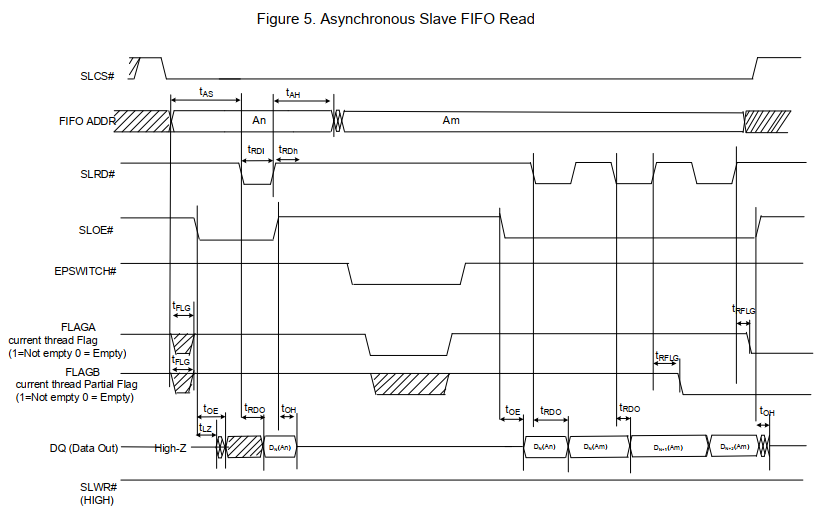 - 来自FIFO的数据在SLRD#断言后驱动。从SLRD#下降沿传播tRDO延迟后,此数据有效。