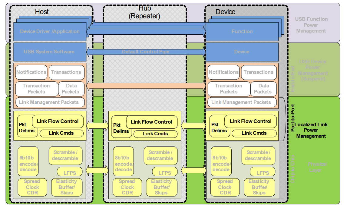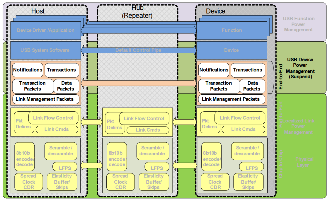 USB3.0的分层机制其实和PCIe类似(协议层(Protocol Layer),链路层(Link Layer)和物理层(Physical Layer)),从某种意义上看,可以把USB3.0看做是PCIe变形版本。下图是分层的通讯结构: