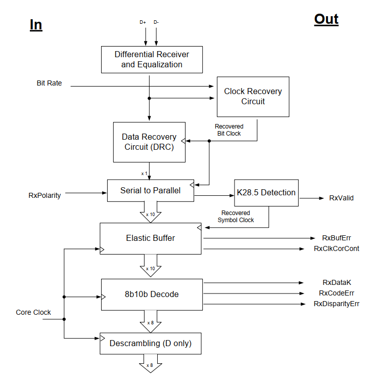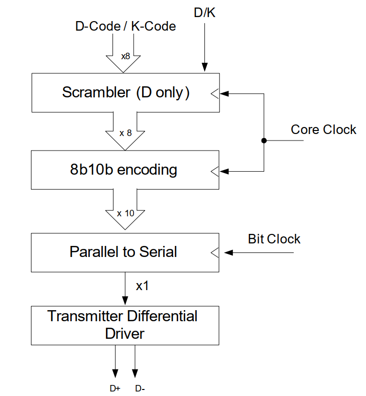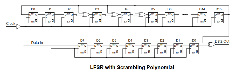 加扰功能使用线性反馈移位寄存器(LFSR)实现。在发送端,加扰应用于8b/10b编码之前的字符。在接收端,对8b/10b解码后的字符应用解扰。无论何时发送或接收COM符号,LFSR都会重置。