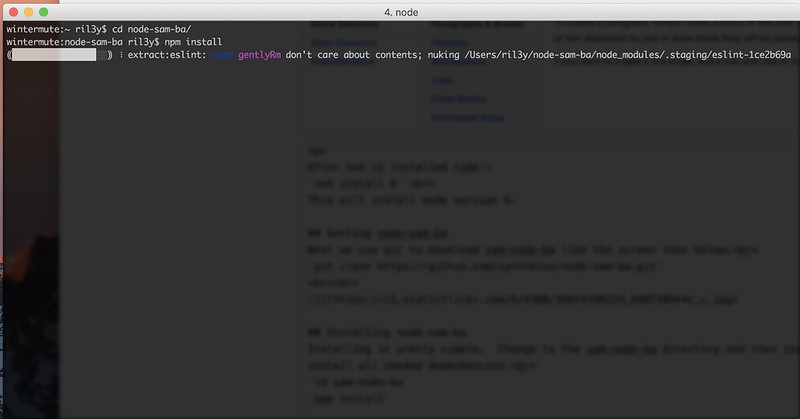 Installing is pretty simple. Change to the node-sam-ba directory and then issue the npm command to download and install all needed dependencies.