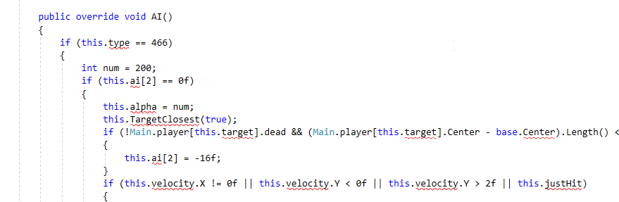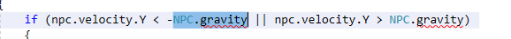 You'll probably notice that there are a lot of NPC type specific sections of code. If you want, you can clean up the code further by deleting sections of the code that would only run for other NPC, but if not, just leave it. Many errors will show up. Most of them can be solved simply by letting Visual Studio add the suggested using statements to our code. If you aren't using Visual Studio or you aren't seeing suggestions or errors, you need to fix that. Read the FAQ if you don't see suggestions. One error in this particular piece of code is NPC.gravity, just change those to 0.3f: