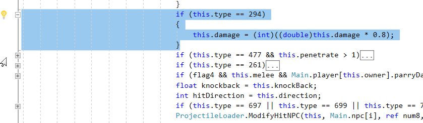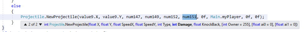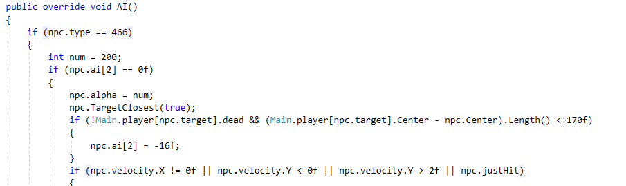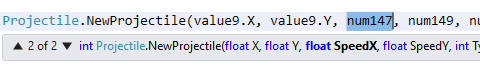 Lets use F2 to quickly make the source code more readable by renaming those variables, then search source for 481 again to find code specific to the original Hoplite. Going through the Find results again, you'll notice that one of the results seems to signify the NPC aiming above the head of the player, another seems to determine throw strength, and another seems to tweak the speedX and speedY to make the projectile a little inaccurate. I'll leave this as an exercise to the reader. Use F2 to rename variables as you figure out their purpose to begin to understand little pieces of the AI code.