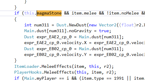 Now we go through the 9 results in search of what we want to know. 2 of the results are setting the bool to true and correspond to ModItem.UpdateAccessory. 1 of the results sets the magmaStone bool to false, this is akin to ModPlayer.ResetEffects. The Results in Player.StatusNPC and Player.StatusPvP seem to be applying a buff to the target. Looking up 24 in BuffID shows us the buff is OnFire. These results correspond to ModPlayer.ModifyHitPvp and ModPlayer.ModifyHitNPC. The 6th result is in Player.ItemCheck and appears to be spawning some Dust. We know that Fire particles spawn when melee weapons are swung, so this code must correspond to that. How would you mimic this behavior yourself? We need to search nearby code and look for tModLoader hooks. tModLoader hooks have code like PlayerHooks.Something or ItemLoader.Something, so lets search for that. Luckily, this result is right next to the hook!
