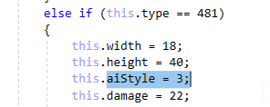 Now lets change the projectile. First, make a hostile projectile or find some other projectile that you wish to use. Now we need to search the AI code to find how the code decides to spawn that javelin for Hoplite. This code being almost 4000 lines of code, we don't want to search blindly. Lets again search for 481 and look for code that seems to either be spawning projectiles or deciding on a projectile to spawn. Most likely to have the results we need are lines with if (NPC.type == 481) on them. Lets look at the first result: