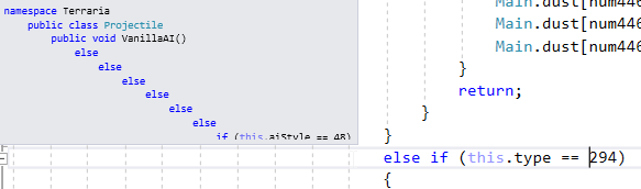 The 4th result is in Projectile.AI, this is the code we'll need to adapt. Below you can see a neat feature of Visual Studio in action. Hover over the guidelines and you'll see a listing of the nested conditions that lead to this code. Notably, we see that this code is within an if statement checking this.aiStyle == 48.
