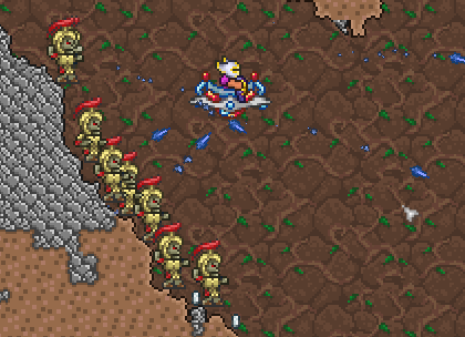 }Go in game and then use a mod with an NPC spawner like Cheat Sheet or HERO's Mod and spawn your NPC. You'll notice that the sprite and behavior is the same as the original Hoplite. (Feel free to change the sprite later the normal way.) While underground, you'll notice that our Hoplite clone attacks with that javelin as normal. The goal of the rest of this tutorial is to change that projectile and other behaviors.
