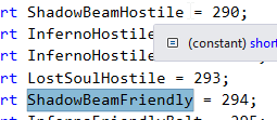 Now that we have the Item working, you may think that modifying the color or number of bounces would be simple, but it is not. This is all hard-coded into the AI of the Shadowbeam Projectile, so unfortunately we have to make a new ModProjectile and edit a copy of the vanilla AI code. Lets first investigate to find where the purple color of the Shadowbeam staff projectile comes from. First, lets look at the Shadowbeam Staff item's Item.shoot value. In Item.SetDefaults, we see this.shoot = 294;. Great, lets find that in ProjectileID.cs: