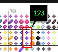 Now that we've found all the relevant code, now we need to investigate how the color is decided. This might be a good time to check what other projectiles use projectile aiStyle 48. Searching for this.aiStyle = 48 reveals that HeatRay, UFOLaser, MagnetSphereBolt, and ShadowBeamHostile all also share aiStyle 48. We know that HeatRay is yellow, but Shadowbeam Staff is purple. Knowing this, we know that the code for the color must be within an if statement within the AI code. Going back to the 4th result, the result in the AI method, we look for anything that looks like code related to color. Ahah! We find the code int num448 = Dust.NewDust(vector33, 1, 1, 173, 0f, 0f, 0, default(Color), 1f); and look up the 173rd dust in the dust spritesheet: