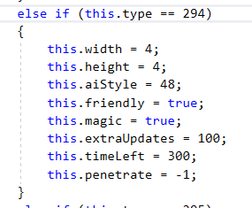 Ah, notice that there is also a ShadowBeamHostile. ProjectileIDs with Hostile in their name usually refer to projectiles shot by enemy NPCs, be aware of this in your future source code exploration. Lets search the source for "294". Most of the 45 results are referring to the Item and Tile that share the ID of 45, but the 4 results in Projectile.cs seem promising. The first result shows us the Projectile.SetDefaults. Of note is this.extraUpdates = 100;, what could that possibly be? As a spoiler, that is how the bouncing effect works. It lets the AI code execute 100 times each frame rather than once as normal. Without it, the instant bouncing effect wouldn't be easily possible. Also noteworthy is this.aiStyle = 48, we will have to find the code for this later.