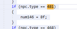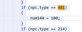 If you test in game now, you'll notice that they behave very odd. This is because all the code that use to dictate Hoplite specific behavior is now inaccessible because NPC.type does not equal 481 any more. Lets fix this. Use find to find all and replace checks for NPC.type == 481 with (NPC.type == 481 || true). Doing this will keep 481 around which will make it easier to find in the next sections.