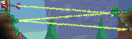 Yep, we've figured out why the Shadowbeam Staff projectile is purple, it is because dust 173 is spawned in AI. Let's remember to change this to spawn dust 178, a lime green projectile, for our modified clone. If you look at the rest of the code for aiStyle 48, you'll probably notice that there is nothing limiting the number of bounces. Through some trial and error, you'll discover that Projectile.extraUpates and Projectile.timeLeft are responsible. A timeLeft of 300 would normally stick around for 5 seconds, but because of extraUpdates being 100, it actually only lives for 3 ticks/frames. Lets change timeLeft to 200 for our weaker clone, this will shorten the reach of our weapon.