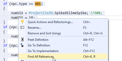 Finally, we come to a result that is setting a couple int variables. Looking up 508 in ProjectileID.cs, we find JavelinHostile = 508;, which definitely sounds correct! Great! Lets change that to some hostile projectile and then use Visual Studio to "Find all References" so we can figure out what num151 is: