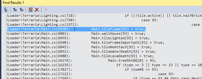 Finally, the last relevant result relates to drawing the Flame texture. Looking at the code around this result, it becomes clear that Main.tileFlame uses hard-coded TileIDs to draw different flame textures. We'll need to re-implement this ourselves and delete Main.tileFlame[Type] = true; from our code to get this working. The closest TileLoader result tells us that ModTile.PostDraw is the hook we will need to use. In addition to adapting this code, we will make a new Flame texture in our mod.