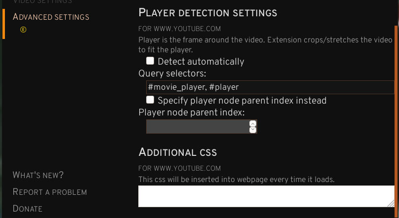 CSS selectors that define the player element(s). You can separate multiple selectors with a comma. This is necessary on some sites as the selector of the player element changes depending on the context (e.g. whether the video is embedded or not).