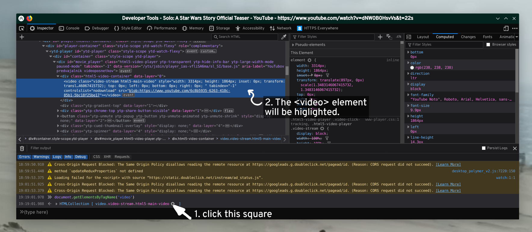 document.getElementsByTagName('video')and press 'enter' -