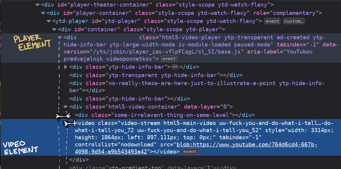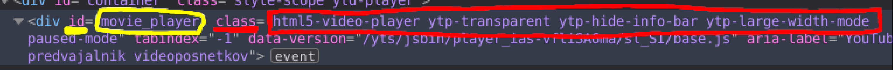 For example, on the example screenshot above, paused-mode and 'ytp-hide-info-bar' sound like something that'll vanish the moment we press 'play', so we will not be using that (similar thing applies to 'ytp-large-width-mode'). There's also some other classes that don't sound terribly relevant ('ad-created', 'ytp-transparent'). 'html5-video-player', on the other hand, sounds like something we can reliably expect to be there always and never change.