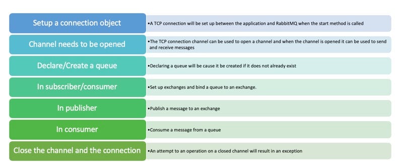Steps to follow when setting up a connection and publishing a message/consuming a message