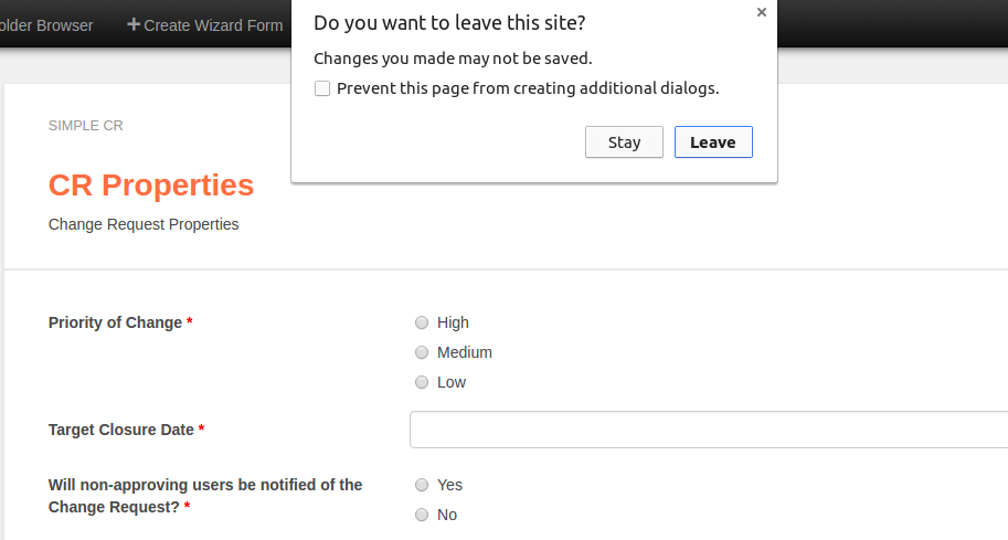 If a user browses away from the Wizard while creating or editing a form, we want to notify the user that they'll lose their changes.