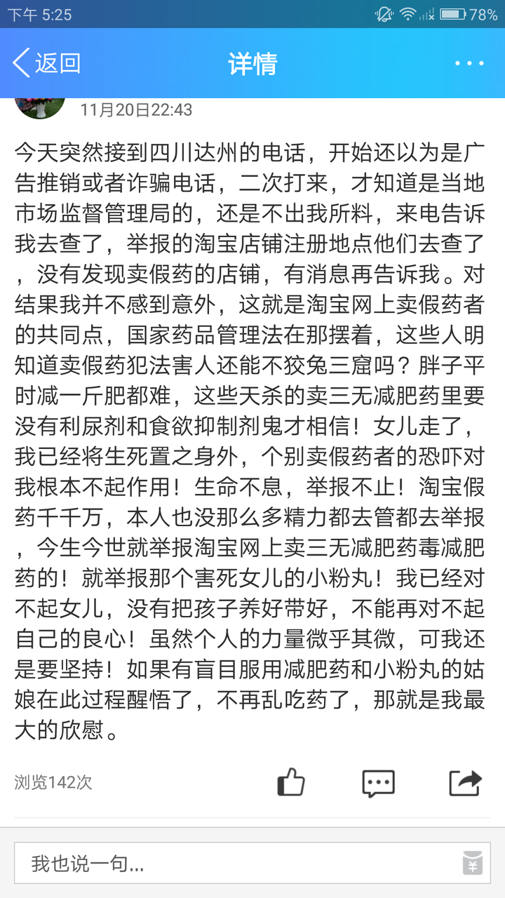 另外她妈妈并没有提供她在淘宝上买到的是假药的证据。(也许有,只是没发在空间。)