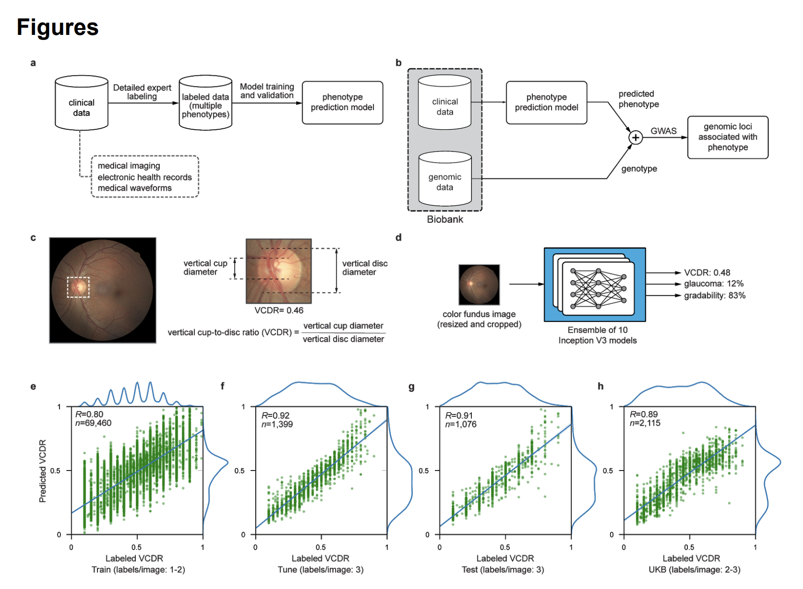This paper used machine learning (ML) to automatically predict VCDR from fundus photographs, an important endophenotype for glaucoma. The ML model was trained using 81,830 fundus photographs that were graded by experts for image gradability, VCDR, and referable glaucoma risk. These photographs were split into training, tuning, and test sets. The authors trained an ensemble of ten Inception V3 deep convolutional neural networks, a type of ML model well-suited for image analysis.