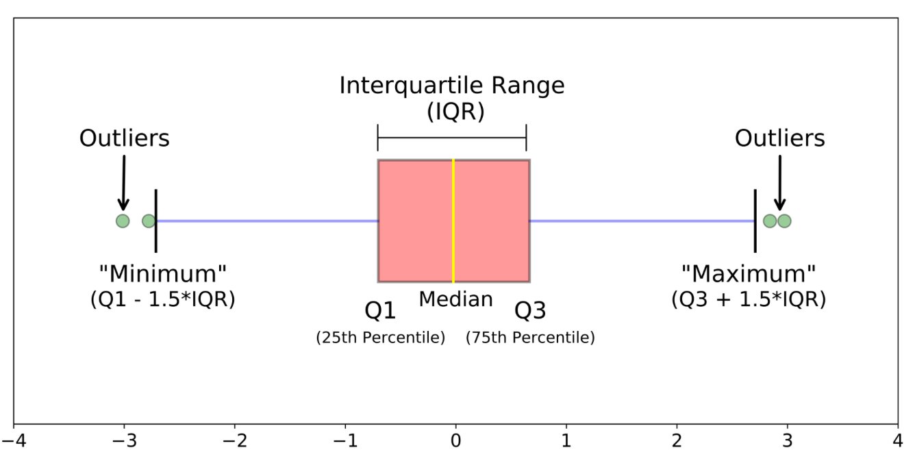 Turkey also gives a criterion for defining outlier data. If Q1, and Q3 are the first and third quartile positions, the interquartile range IQR = Q3 - Q1, then an outlier value will fall below Q1 - 1.5 IQR or above Q3 + 1.5 IQR.