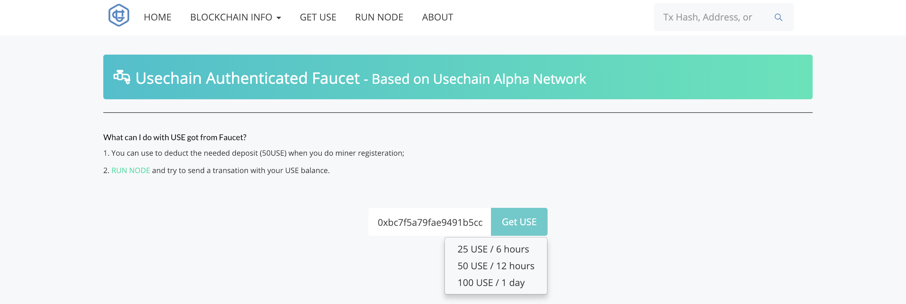 GET USE 页面, 领取测试币。