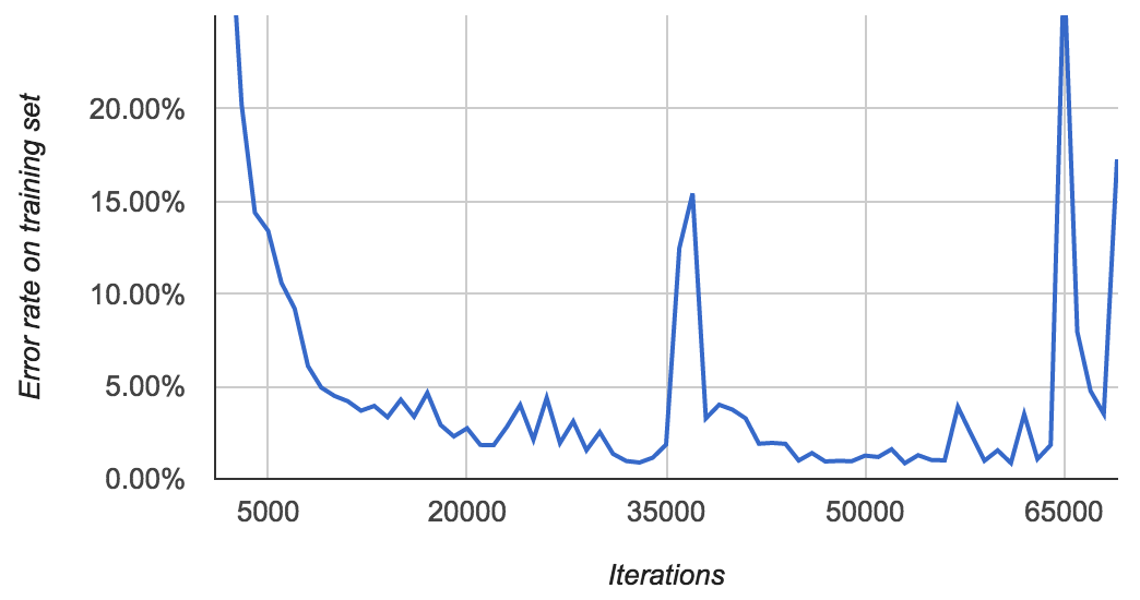 It achieves an error rate of 0.89% at iteration 33,000, then spikes to over 15% at 37,000. It eventually gets back down to 0.85% after 53,000 iterations, then starts spiking again. By the time I stopped it, I was again seeing lots of FloatingPointErrors.