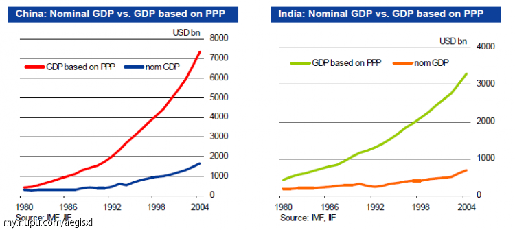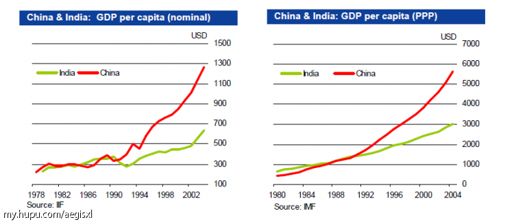 1.3 名义GDP vs GDP(PPP),左:中国,右:印度。可见中印两国的PPP计价的GDP都明显高于名义GDP,这也是认为两国货币价格过低的依据之一