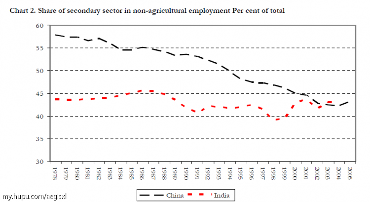 本科时候学过一门中国经济研究课程,选上才发现是面对留学生开的,不过因祸得福了解了很多国外对于中国经济的观点 其中有一大章节就是中印经济的对比 可惜那是N年前学的 如今电脑都换了资料也没了 但是看防区一直以来对印度兴趣甚浓却只有“干了恒河水”一个调子 感到太过空洞 因此从各路网络摘抄一些图表数据 供大家讨论