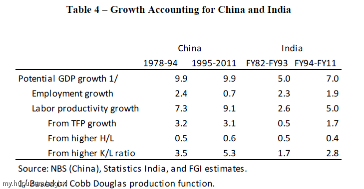 从这个表可以看出,中国的人口福利其实相较于印度,在94-11年间已经没有,但是中国的TFP和人均资本增速都明显高于印度,另一方面,两国的人力资本水平基本变化一致,近20年中国略好于印度